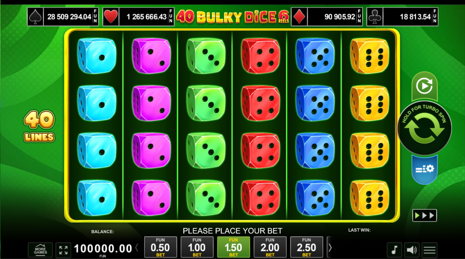 The 40 Bulky Dice 6 Reels slot uses a non-standard layout of 6 reels and 4 rows, which is uncommon in the world of dice slots. The game operates with 40 fixed paylines, meaning every spin is optimized for potential wins. Despite the additional reel, the interface remains intuitive and easy to understand. The controls include:
