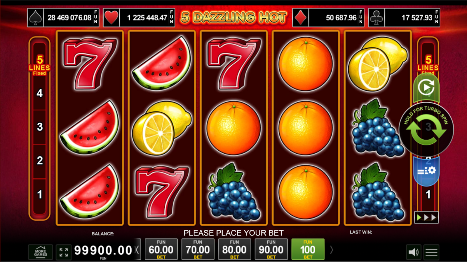 Before switching to real-money play, it is best to test the 5 Dazzling Hot free version. The demo mode is identical to the real game, except that it uses virtual credits, so there is no risk involved. 5 Dazzling Hot demo allows you to: learn all symbols and their values