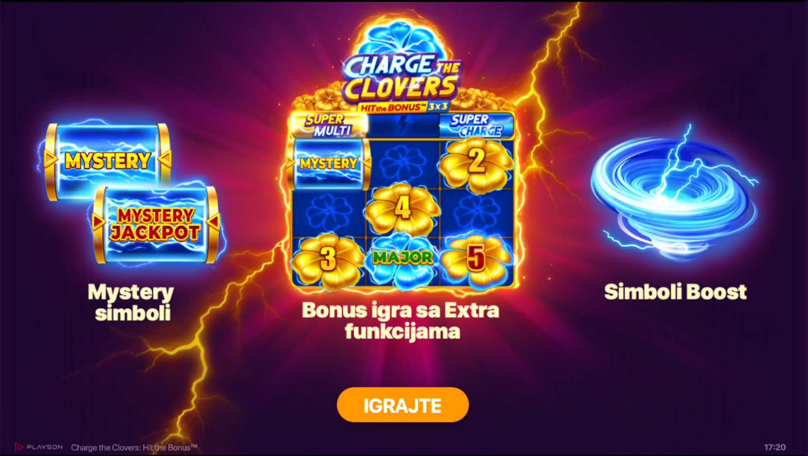 As one of the most consistent slot developers in recent years, Playson is a studio that rarely lets players down. Their titles balance simplicity with innovation, and each new release carries the recognizable signature of stable mechanics, attractive visuals, and clear objectives. That approach is easy to see in Charge the Clovers: Hit the Bonus by Playson. The studio kept the technical core of a classic “fruit” format (3×3, 3 paylines) while removing standard payouts and replacing them with a bonus system that rewards every symbol during the bonus phase — whether it’s a Mystery, Sticky Bonus, or Jackpot. This is not the first time Playson has explored Hold and Win–style gameplay, but Charge the Clovers feels like one of the fastest and most compact examples of the concept. The slot is designed so that every second can shift the outcome — through added multipliers or surprise jackpot symbols.