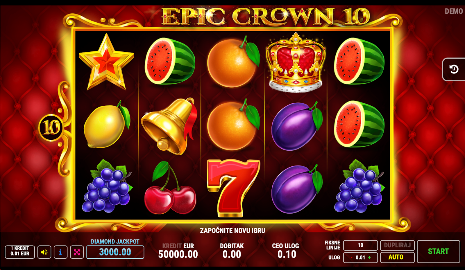 For players who want to test the game before wagering real money, the Epic Crown 10 demo mode is available. Playing without registration or risk allows users to: