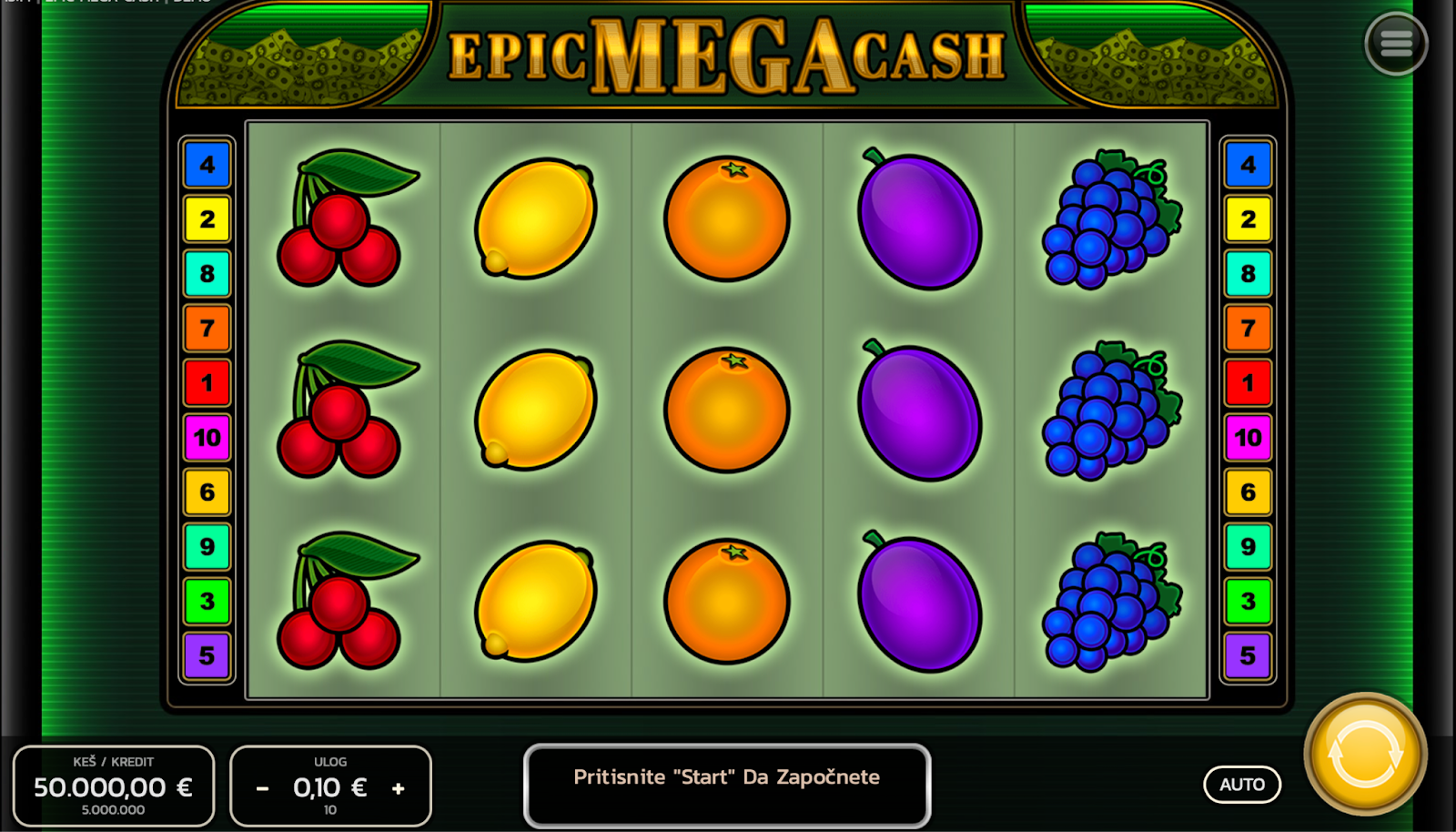 Epic Mega Cash follows a proven visual concept: colorful fruit symbols, shiny gold coins, and classic slot icons placed against an elegant dark background with shimmering highlights. Each symbol is clearly defined and uses pleasant color tones, while winning combinations are enhanced by flashes and multiplier animations.