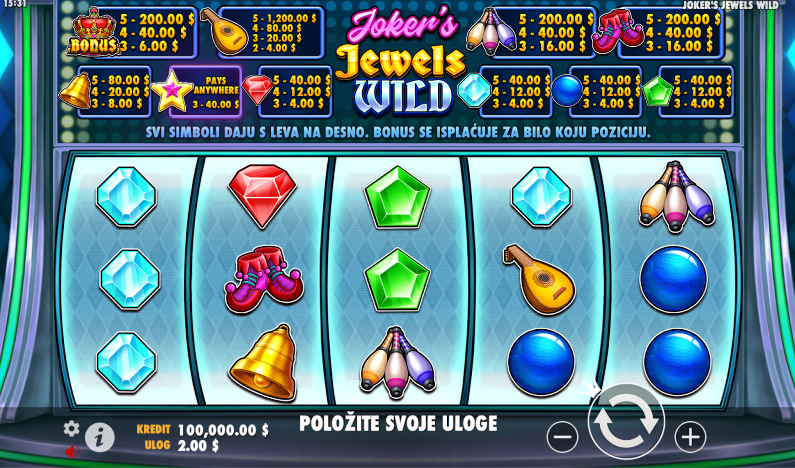 Launch the Joker’s Jewels Wild demo and get familiar with the symbols